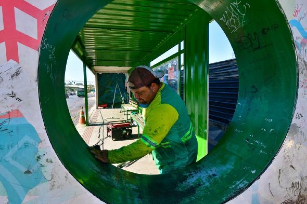 A Empresa Cuiabana de Zeladoria e Serviços Urbanos (Limpurb) está realizando o trabalho de manutenção no abrigo de passageiros instalado em frente ao Pantanal Shopping,