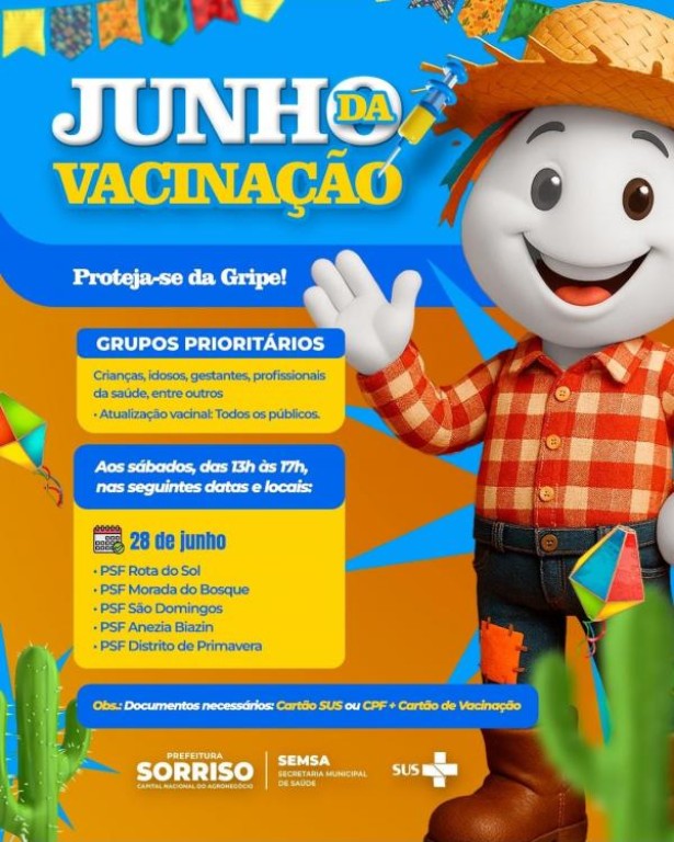 A campanha Junho da Vacinação contra a gripe continua mobilizando as unidades de saúde de Sorriso. Neste sábado, 28 de junho, acontece o terceiro plantão especial da ação, com atendimento das 13h às 17h em cinco pontos estratégicos: