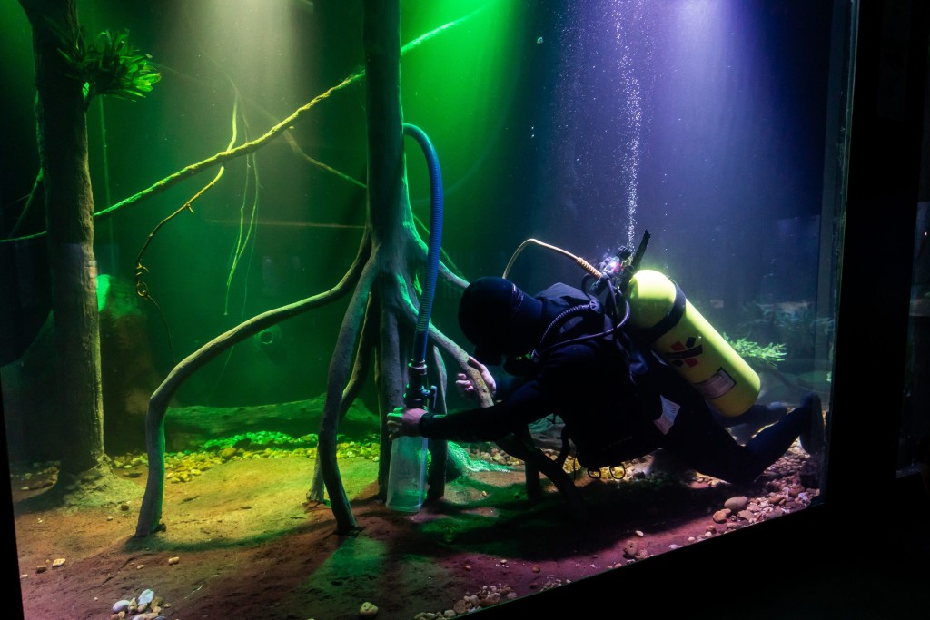 A manutenção e limpeza do aquário são realizadas sempre às segundas-feiras, dia em que o espaço turístico permanece fechado ao público. Entre os profissionais responsáveis pelo serviço está o biólogo e mergulhador Matheus Lima.