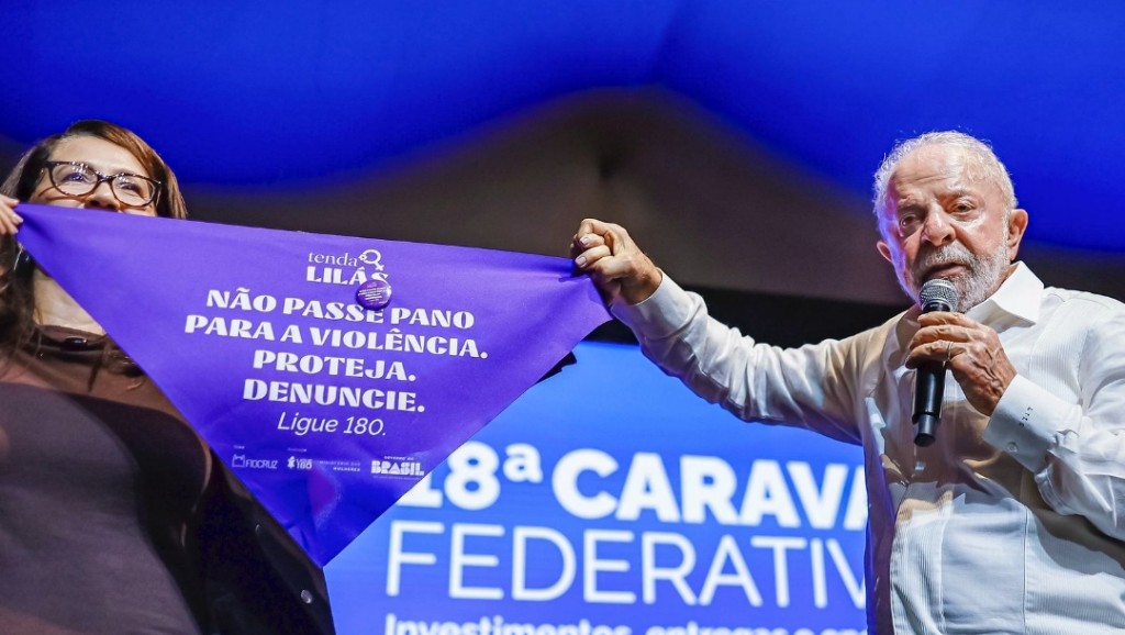 O presidente Lula, em seu discurso na abertura reforçou o motim da Tenda Lilás, uma iniciativa do ministério das Mulheres ao lado de Eutália “Não passe pano para a violência. Proteja. Denuncie. Ligue 180”.