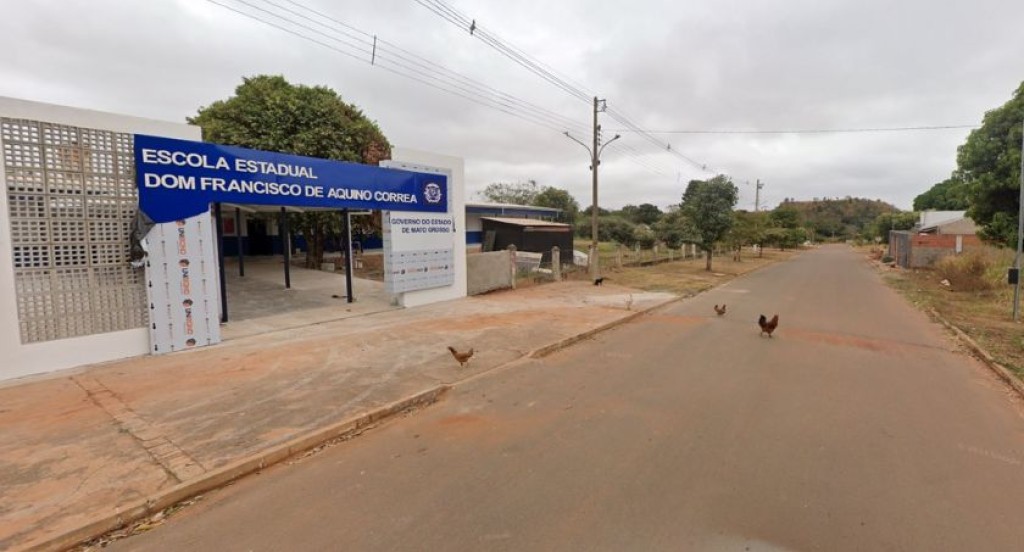 #PraTodosVerem – A imagem mostra a fachada de uma escola em um dia nublado. O nome da escola, visível em um toldo azul na entrada, é “Escola Estadual Dom Francisco de Aquino Correa”. A entrada principal é moderna, com paredes brancas e detalhes azuis. Em frente à escola há uma rua não pavimentada, de terra, com algumas galinhas e galos andando pela área e na rua. No fundo, é possível ver árvores, vegetação e algumas casas simples.