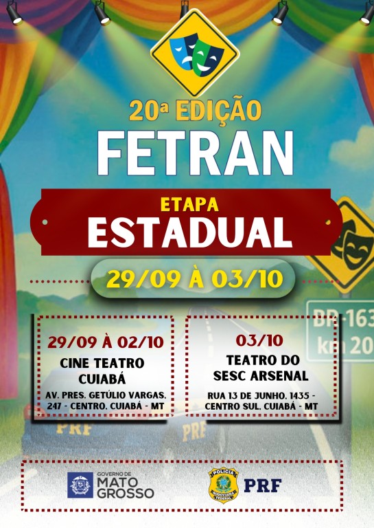 Cuiabá será o centro da cultura, da educação e da conscientização no trânsito. Entre os dias 29 de setembro e 2 de outubro, o histórico Cine Teatro Cuiabá receberá a Etapa Estadual da 20ª edição do Festival Estudantil Temático de Teatro para o Trânsito (FETRAN), promovido pela Polícia Rodoviária Federal (PRF) em parceria com a Secretaria de Estado de Educação (Seduc-MT) e o Detran-MT.