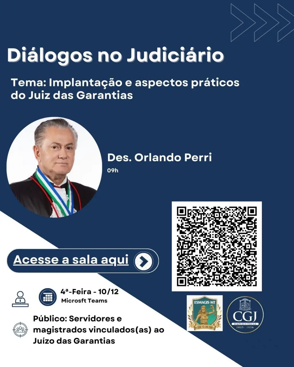 A Corregedoria-Geral da Justiça de Mato Grosso (CGJ-MT), em parceria com a Escola Superior da Magistratura e Escola dos Servidores, promove nesta quarta-feira (10 de dezembro), às 9h, o segundo ciclo do “Diálogos no Judiciário”. Desta vez, o expositor será o desembargador Orlando de Almeida Perri, que vai falar sobre implantação e aspectos práticos do Juiz das Garantias.