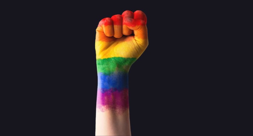 #PraTodosVerem – A imagem mostra um punho fechado erguido, símbolo de resistência e luta, com a mão e parte do braço pintados com as cores do arco-íris, representando a bandeira LGBTQIAPN+. O fundo é preto, o que destaca ainda mais as cores vibrantes da mão, reforçando a mensagem de orgulho, força e reivindicação de direitos da comunidade.
