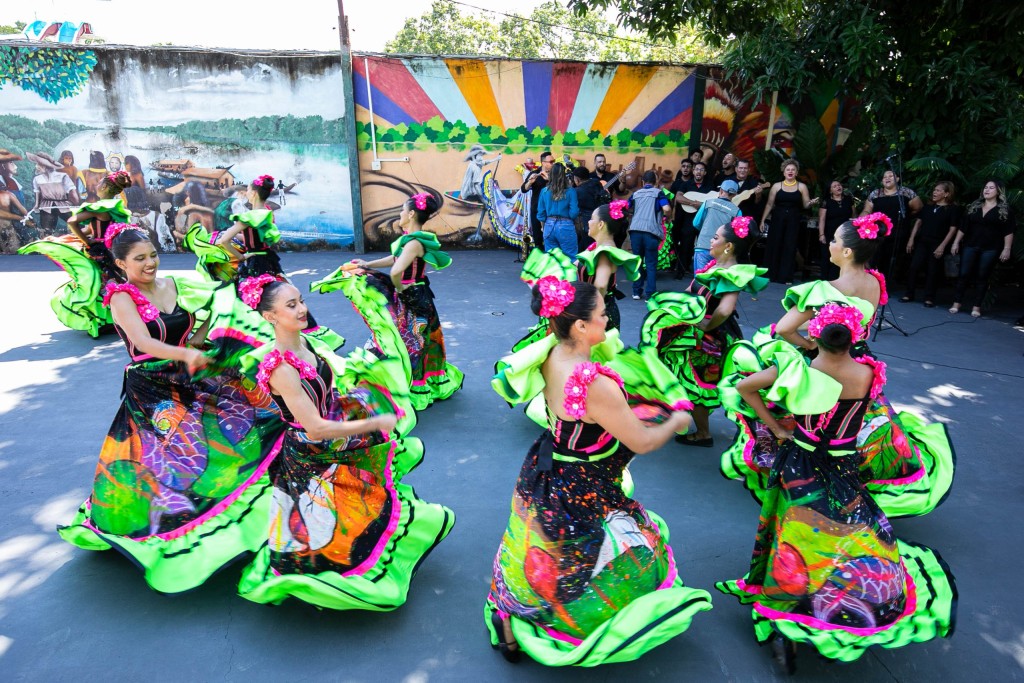 A imagem mostra a apresentação do grupo, com várias mulheres em trajes coloridos que enaltecem traços da cultura cuiabana.
