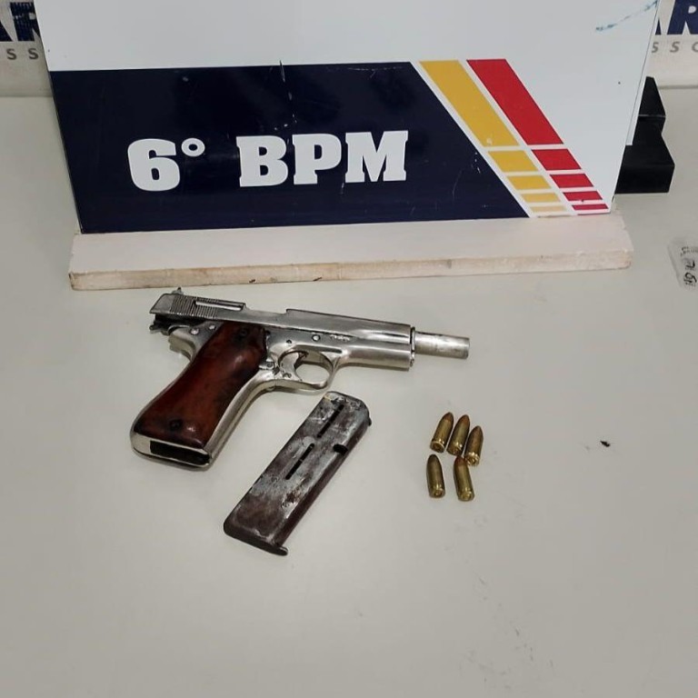 Diante da suspeita, os policiais iniciaram acompanhamento e abordaram ao homem, dentro do estabelecimento. Na revista pessoal, foi localizada uma pistola de calibre .9mm que estava carregada com cinco munições.