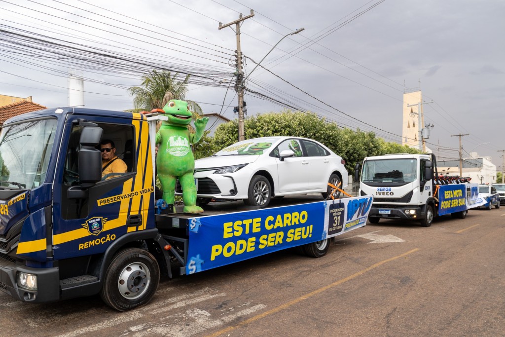 No trajeto do Palácio da Cidadania, na Vila Aurora, até o Parque de Exposições Wilmar Peres de Farias, na saída para Guiratinga, os prêmios da campanha IPTU Premiado 2025 chamou muita atenção das pessoas. O Corolla é avaliado em R$ 180 mil e as 10 motos em R$ 12 mil cada.