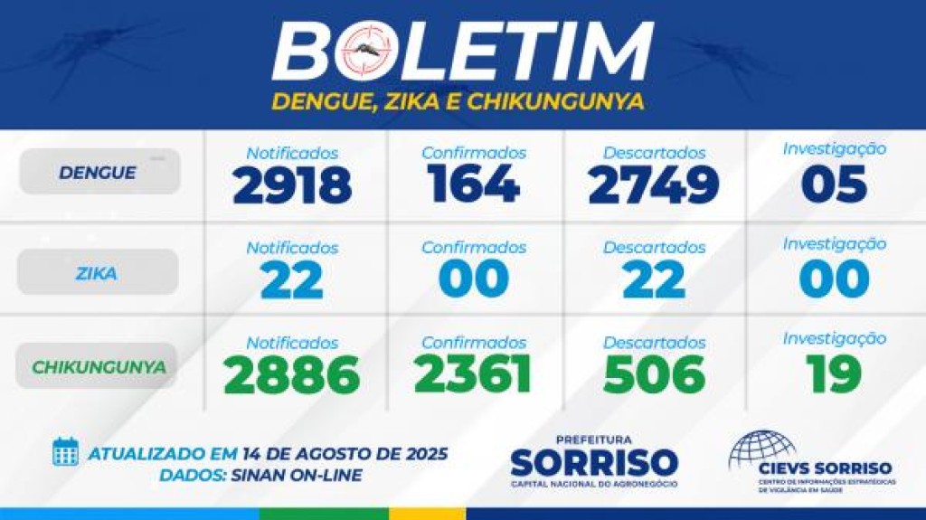 Sorriso voltou a registrar alta nos casos de chikungunya. Desde o dia 24 de julho, quando o último boletim de arboviroses foi divulgado, até esta manhã, 14 de agosto, 342 novos casos foram contabilizados, totalizando 2.361 registros desde janeiro até o momento. Os dados atualizados foram divulgados nesta manhã, 24, pela Secretaria de Saúde, por meio do Centro de Informações Estratégicas de Vigilância em Saúde (Cievs) e constam no Sistema Sinan On-line.