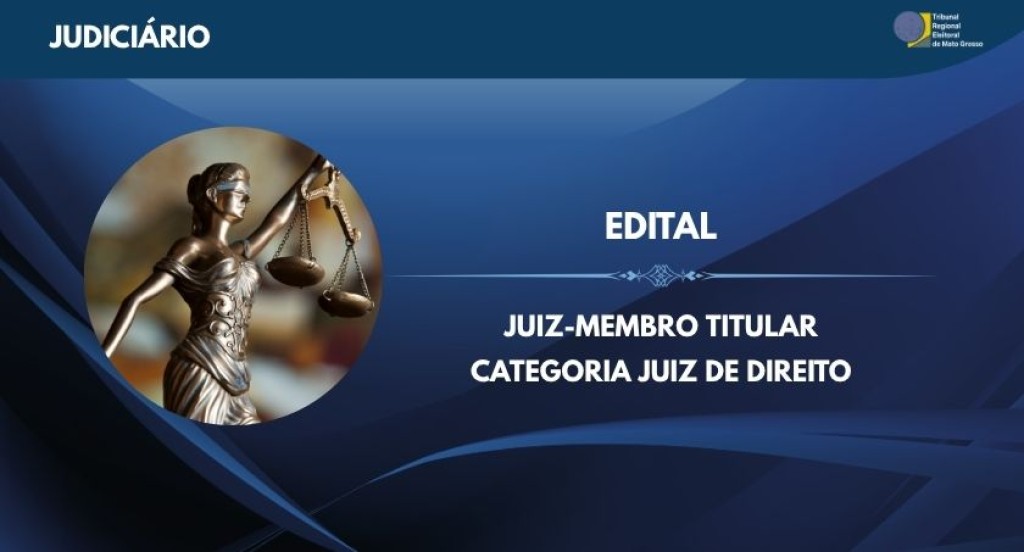 #PraTodosVerem: A imagem possui o título “JUDICIÁRIO” no canto superior esquerdo e o logotipo do Tribunal Regional Eleitoral de Mato Grosso (TRE-MT) no canto superior direito. Ao centro, destaca-se o texto “EDITAL – VAGA DE JUIZ-MEMBRO TITULAR”, sobre um fundo em tons de azul. À esquerda, há uma figura da estátua da deusa Têmis, símbolo da Justiça, segurando a balança.